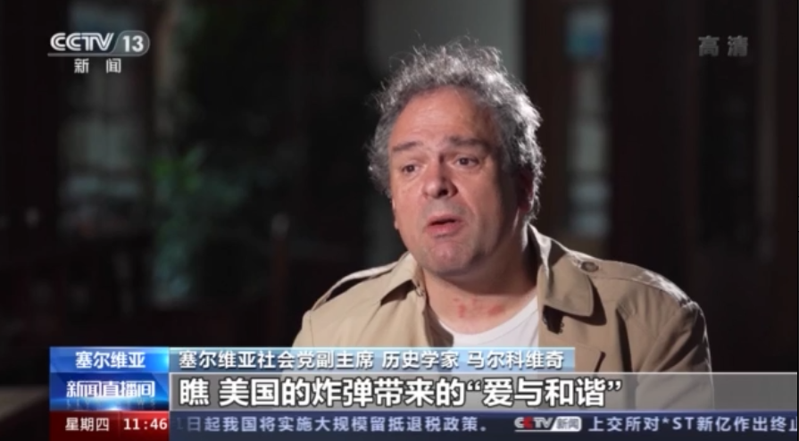 塞尔维亚社会党副主席 历史学家 马尔科维奇:今年此刻发生的,证明了美帝国主义政策的绝对荒谬,他们为乌克兰的儿童、妇女、老人流泪,而当他们轰炸塞尔维亚时,你没有看到这样的消息,你看到的是《时代》杂志的封面上赫然写着,“让塞尔维亚人屈服”。背后是硝烟弥漫的伏伊伏丁那省,他们不仅没有为塞尔维亚受害者感到难过,那些为帝国主义意志服务的媒体,还要求对塞尔维亚人进行更严厉的惩罚。