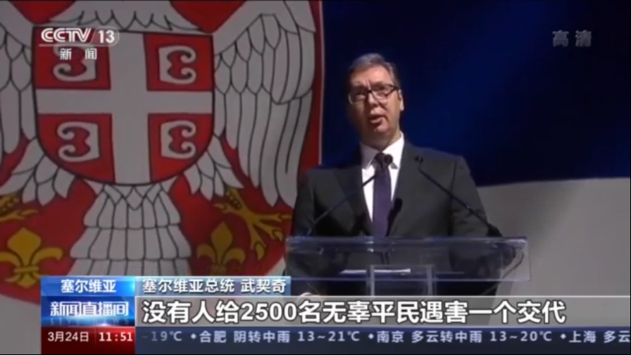 塞尔维亚总统 武契奇:至今没有人对这一滔天罪行负责,没有人给2500名无辜平民遇害一个交代,保卫国家的士兵和警察却被冠以罪名,没有人对6000多名伤者负责。