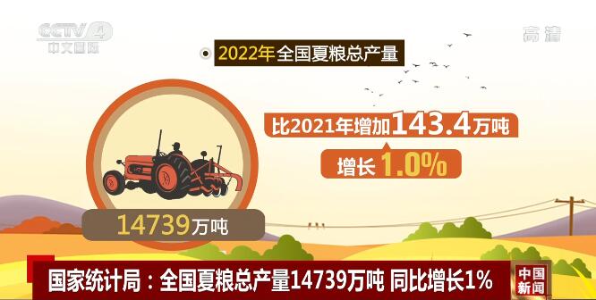 国家统计局7月14日公布的数据显示,2022年全国夏粮总产量14739万吨,比2021年增长1.0%。