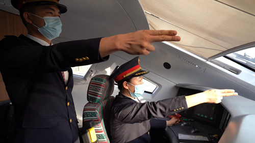 李全珍与副司机运行途中“眼看、手指、口呼”确认地面信号显示。(受访者供图)