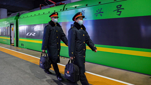 2022年3月8日,李全珍首次正式驾驶复兴号动车组在乌鲁木齐站准备发车。(受访者供图)