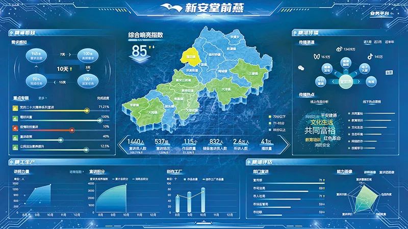 为深入学习宣传贯彻党的二十大精神,浙江杭州建德市推出“新安堂前燕”数字化应用场景2.0版,以数字赋能提升基层理论宣讲成效。图为“新安堂前燕”数字驾驶舱。 建德市委宣传部供图