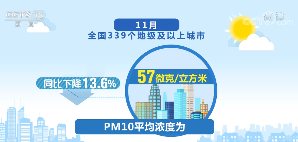 11月,全国339个地级及以上城市PM2.5平均浓度为34微克/立方米,同比下降5.6%;PM10平均浓度为57微克/立方米,同比下降13.6%;二氧化硫、二氧化氮、一氧化碳的平均浓度有所下降,臭氧平均浓度略有上升。