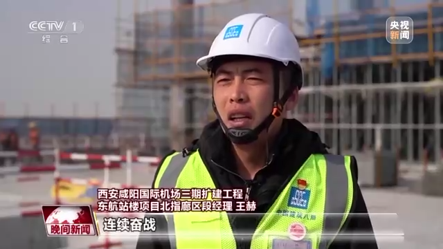西安咸阳国际机场三期扩建工程东航站楼项目北指廊区段经理 王赫:我们春节期间组织了近千余人,连续奋战,预计一周时间北二指廊就会全面封顶。