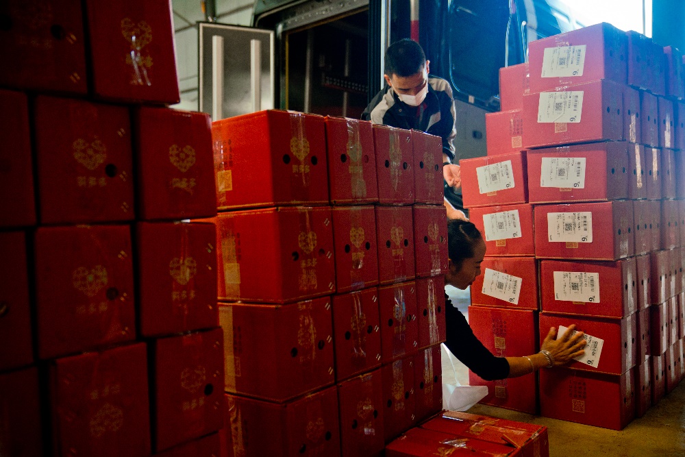 4月27日,云南蒙自洋葱产地直发至中国一线城市消费者的洋葱打包车间里,工作人员正在将贴上拼多多电子面单的快递包裹送至顺丰冷链运输车前装箱。随着拼多多农产品上行的优势不断凸显,蒙自三四年的时间已经涌现2000多家拼多多商家,在当地已能实现省级分拨待遇,新鲜农产品当日即可直发全国。(穆功 摄)