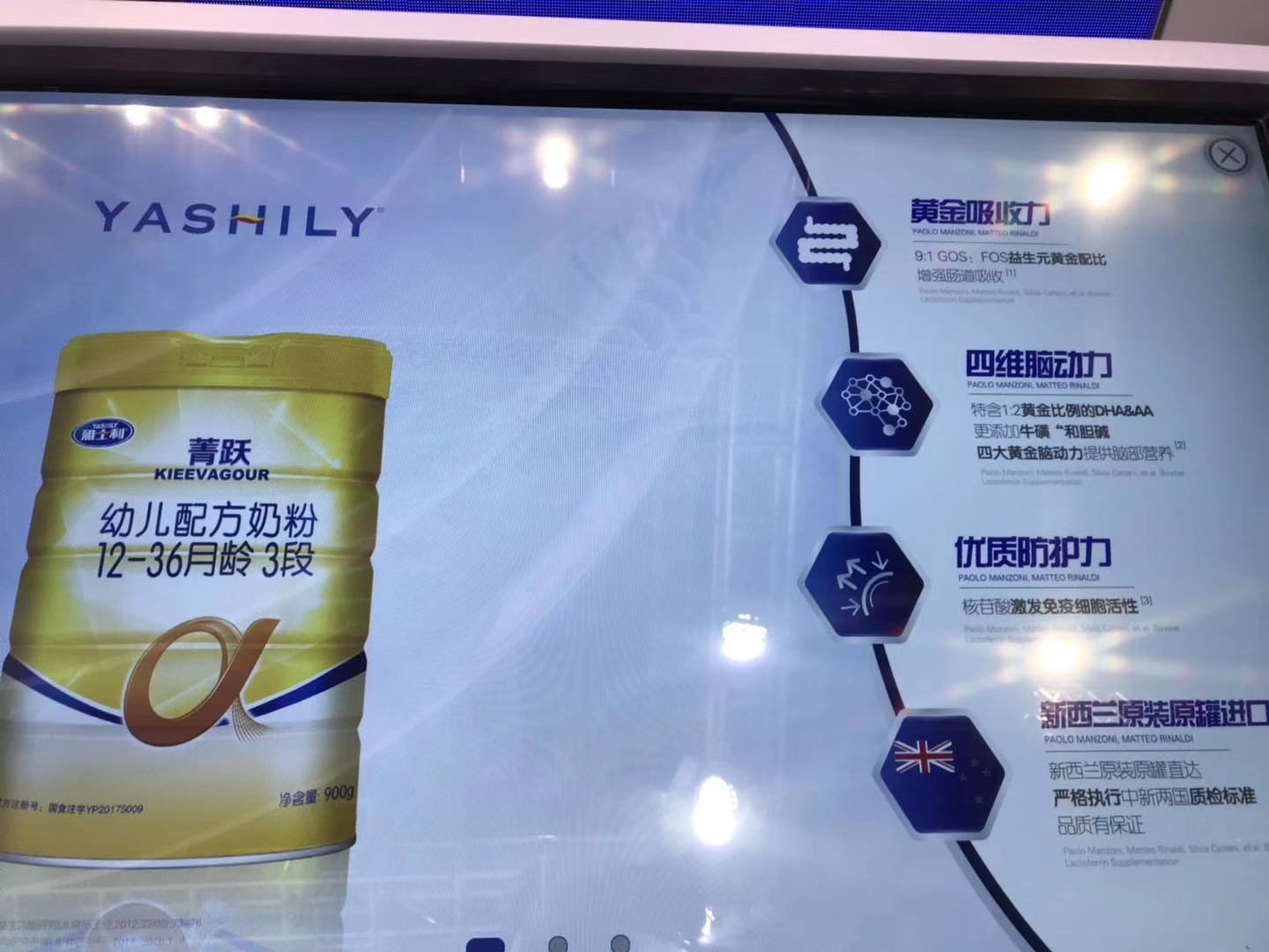 雅士利集团的体验区设有互动触控屏和全系投影展示柜,点击触控屏,菁跃幼儿奶粉配方的介绍就出现——“新西兰原装原罐进口,富含核苷酸可以激发免疫细胞活性……”再点击下一页,雅力士集团的子品牌朵拉小羊羊奶等产品的背景也一一呈现在屏幕上。