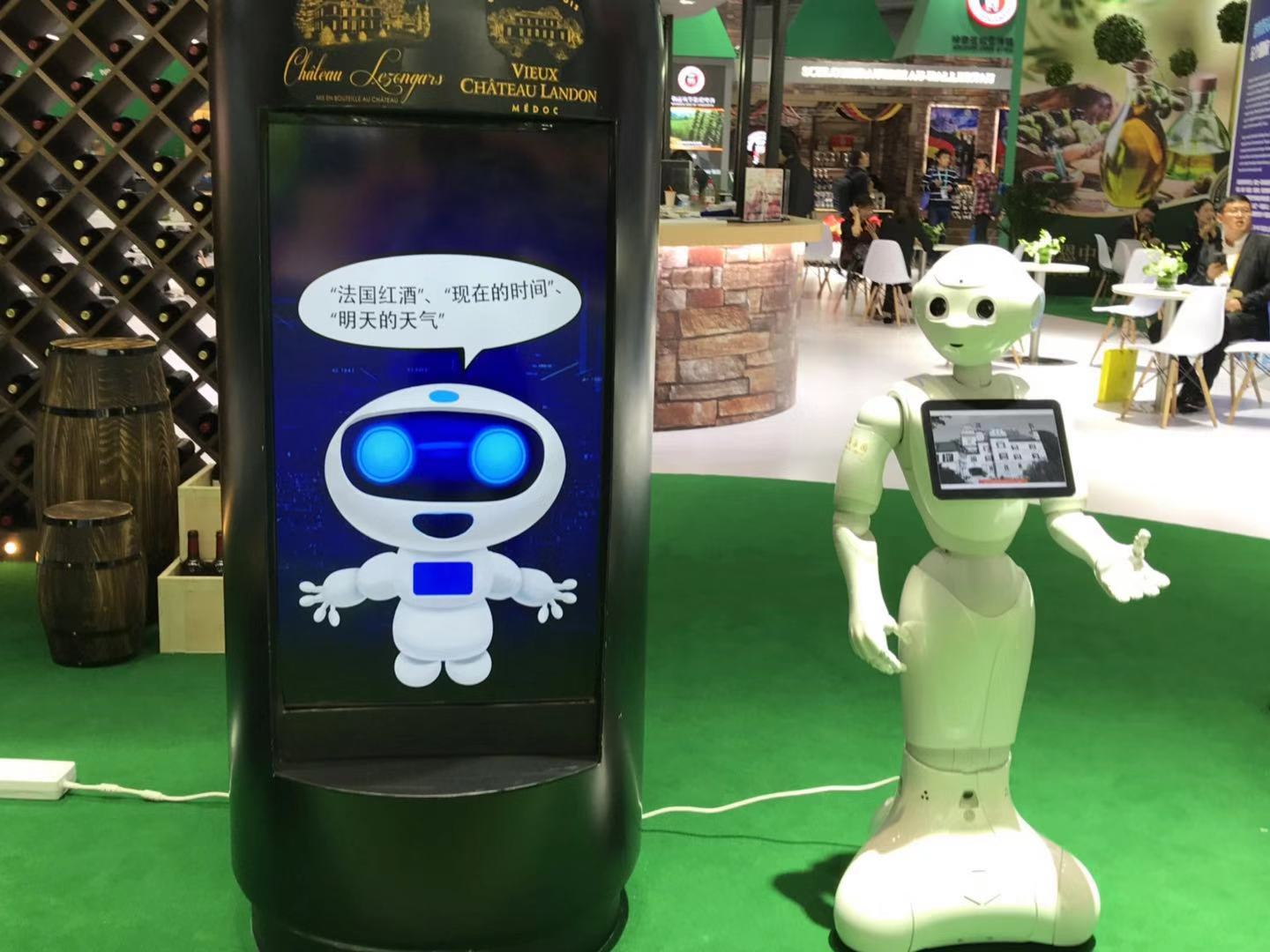 “你好,请介绍一下这款红酒”——大商集团的展柜旁,智能机器人可以和观众进行简单互动。