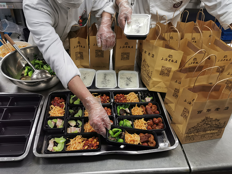 因提供的团餐口味经典、营养均衡、价格惠民,上海老饭店继而被列入《上海市供餐外送服务餐饮企业名单》。订单量持续稳定攀升,从最开始的70份到现在日均600份左右,厨房开始了“流水化”高效操作,口罩、手套、消毒洗手液等物资的采购量也在增加。