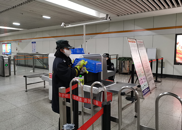 人民广场站会合点附近入站安检人员表示,安检处消毒频次提高,一小时消毒一次。