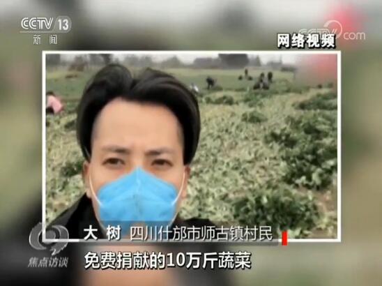 这是什邡市师古镇的一个农村网红,网名叫大树哥。疫情发生以后,他也想为武汉做点什么。他说,自己没什么钱,但是地里有菜。