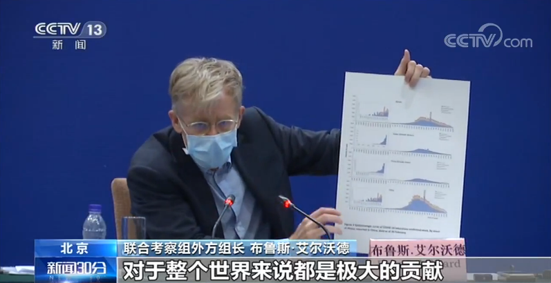 中国—世界卫生组织新冠肺炎联合专家考察组新闻发布会上,联合考察组外方组长,世界卫生组织总干事高级顾问布鲁斯·艾尔沃德还展示了两张图表。图表展示了中国应对疫情的举措,为控制病毒的传播作出了巨大贡献,也为其他国家和地区的防疫工作争取了宝贵时间。