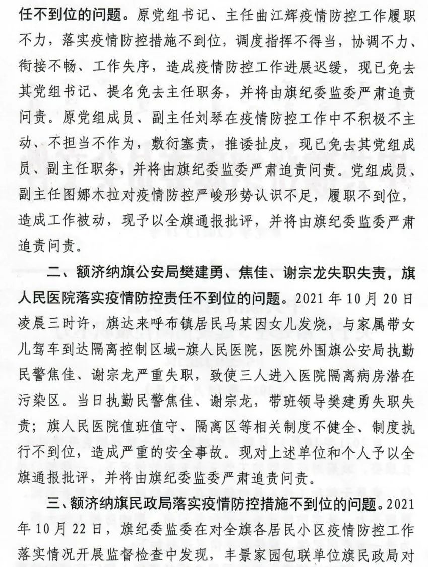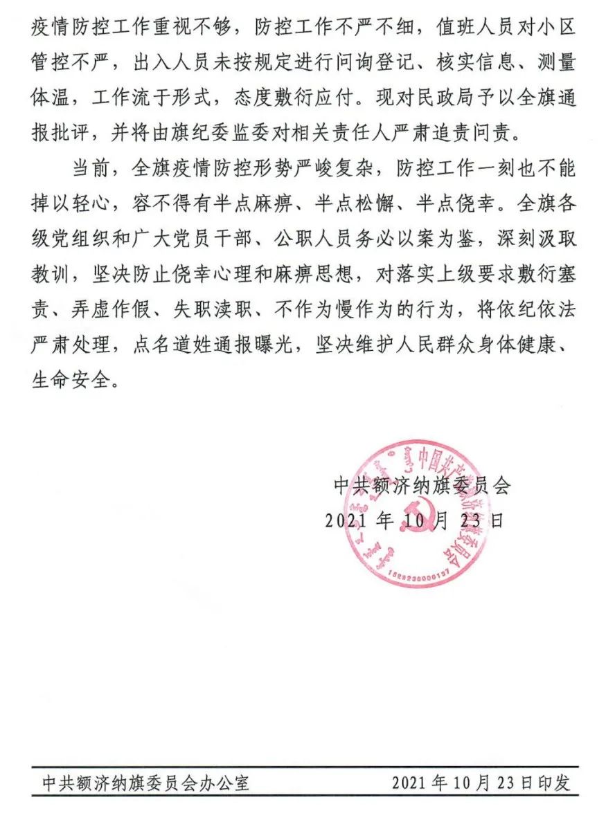 内蒙古额济纳旗严肃处理3起疫情防控履职...