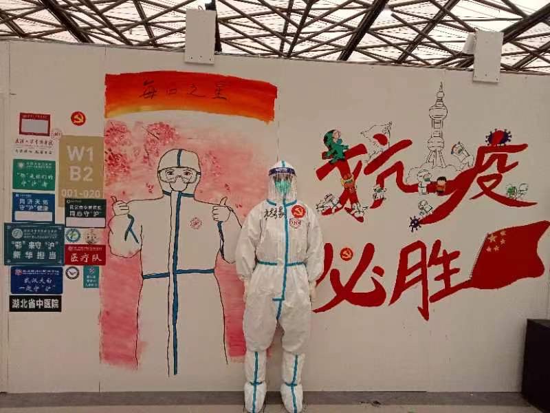 在新国博方舱的W1馆内,有一面墙上画着上海地标,还写上了“抗疫必胜”几个大字,这是来自武汉医疗队的年轻医护创作的。