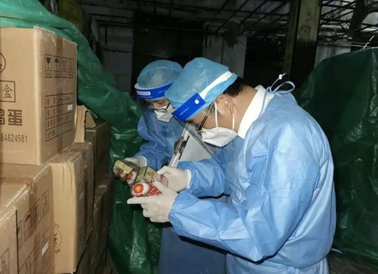 (图为市场监管局工作人员仔细检查涉事咸鸭蛋,上海市场监管局供图)