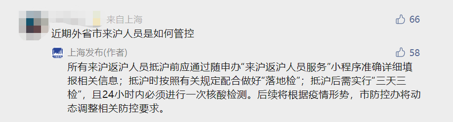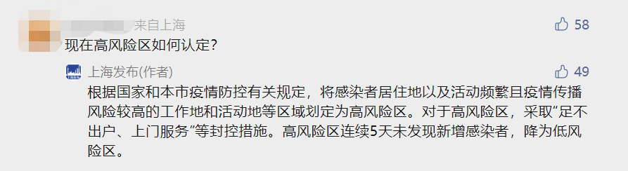 同时还有网友留言:近期外省市来沪人员是如何管控?现在高风险区如何认定?
