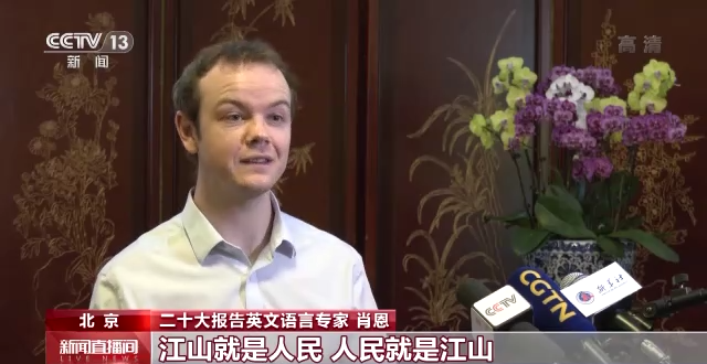 二十大报告英文语言专家 肖恩:以人民为中心的发展思想,“江山就是人民,人民就是江山”,这些表述真正诠释了中国共产党注重与人民之间的血肉联系,全心全意致力于让人民生活得更好,为人民服务。