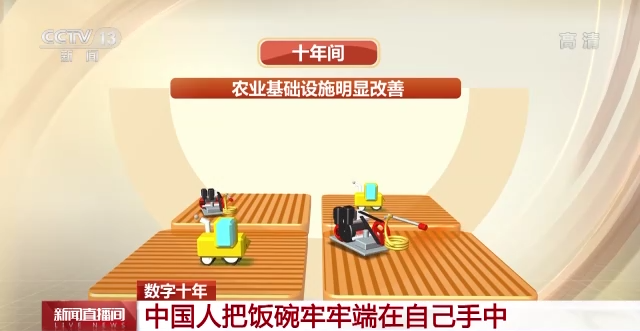 十年间,农业基础设施明显改善,累计建成9亿亩高标准农田,配套建设一批现代化灌区,农田有效灌溉面积占比超过54%,靠天吃饭的局面加快改变。