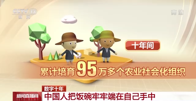 十年间,累计培育95万多个农业社会化组织,服务面积近17亿亩次,服务带动小农超过7800万户。全国农作物耕种收综合机械化水平从57%提高到72%以上,水稻、玉米、小麦三大粮食作物机械化率分别超过85%、90%和97%。