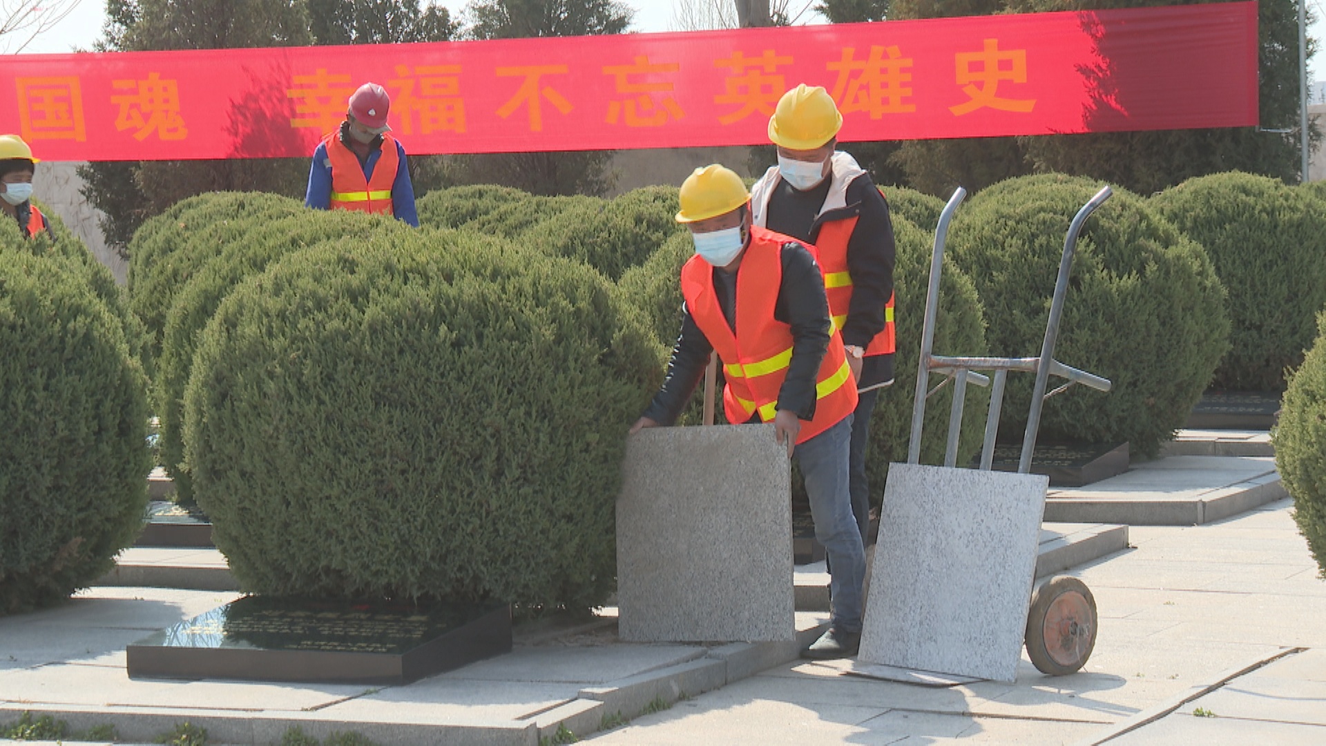 青松翠柏,缅怀英烈。清明将至,在天津市武清区烈士陵园内,工作人员正对园区纪念碑周边地面进行修缮,维护修缮工作将于近期全部完成。